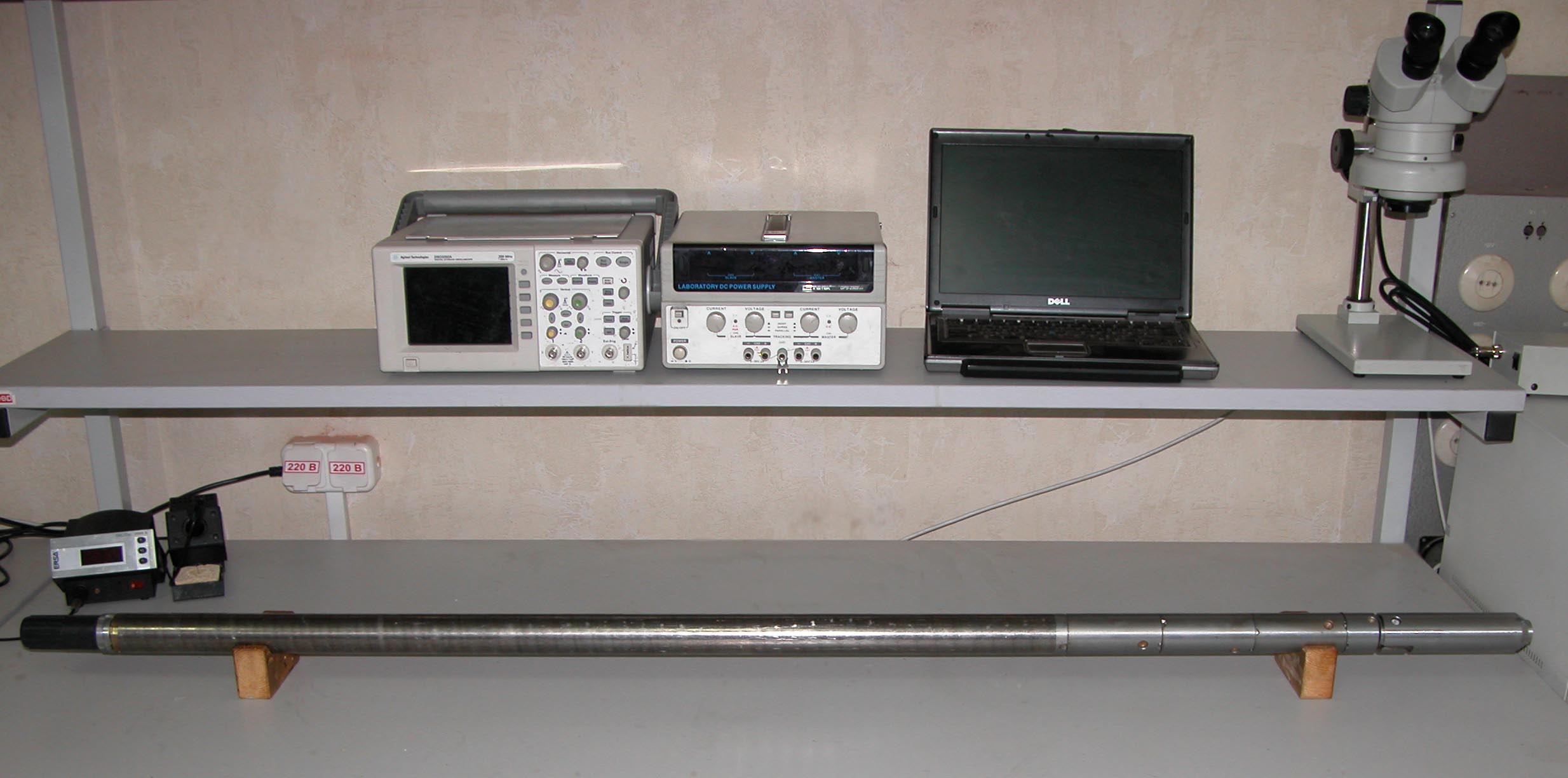 Скважинный прибор двухзондового нейтрон-нейтронного каротажа ЦСП-2ННК-43 Прибор предназначен для количественного определения эффективной пористости пластов и литологического расчленения разрезов в условиях скважин различного назначения методом 2ННКт. Скважинный прибор работает с каротажным регистратором «Вулкан V3». Эксплуатируется с одножильным и трехжильным каротажным кабелем. Технические характеристики Диапазон измерения водонасыщенной пористости: 1-40% Относительная погрешность измерений: 5% Длины зондов (ближний/дальний): 300/600 мм Напряжение питания прибора: 60 В Тип источника нейтронов: ИБН-8-5 Максимальная рабочая температура: 80/120 °С Максимальное гидростатическое давление: 20/100 МПа Диаметр: 43 мм Длина: 1600 мм Вес, не более: 18 кг Цена: по запросу