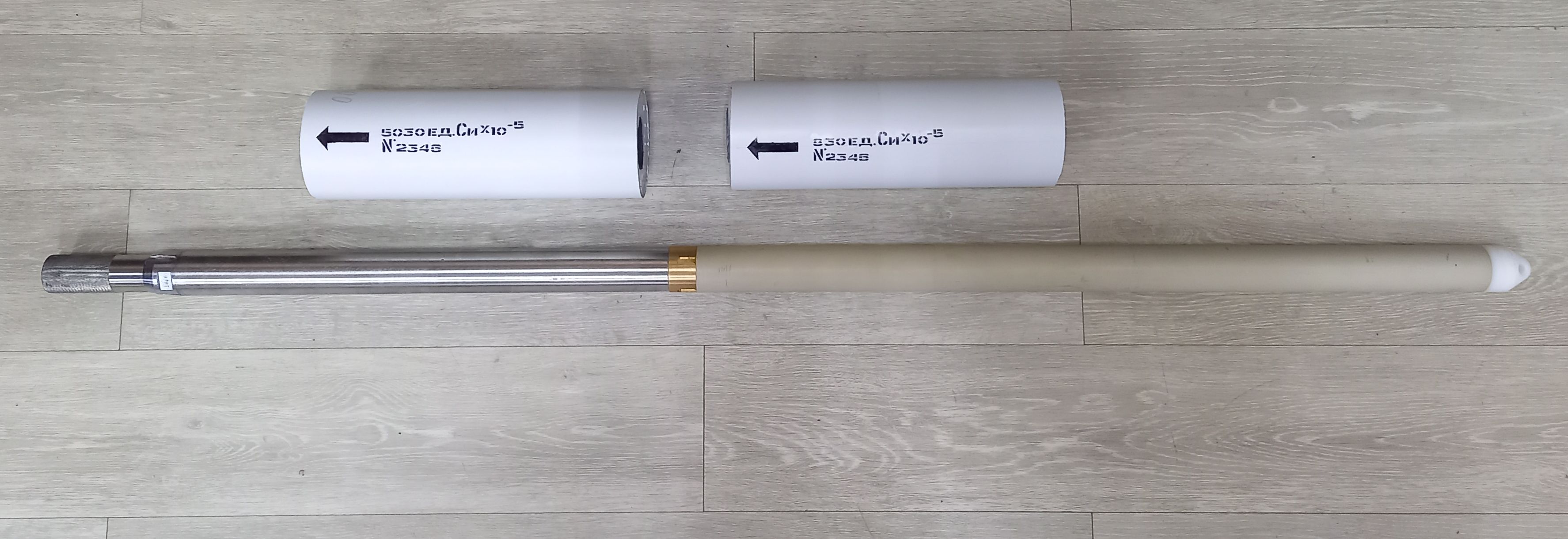 Скважинный прибор каротажа магнитной восприимчивости КМВ-Ц-43 Предназначен для измерения магнитной восприимчивости (каппа, æ) горных пород в условиях естественного залегания методом намагничивания пород низкочастотным электромагнитным полем и измерения их вторичного поля. Предназначен для работы с каротажным регистратором «Вулкан V3». Эксплуатируется с одножильным и трехжильным каротажным кабелем. Достоинства и преимущества • повышенная стабильность нулевого уровня сигнала; • высокая чувствительность к содержанию в горных породах магнитных минералов в стандартном исполнении с возможностью измерения повышенного содержания ферромагнитных минералов в «грубом» исполнении. Технические характеристики Диапазон измерения магнитной восприимчивости (æ) в стандартном исполнении: 20•10^--5 - 15000•10^--5 ед. СИ Диапазон измерения магнитной восприимчивости (æ) в «грубом» исполнении: 1000•10^--5 - 200000•10^--5 ед. СИ Основная абсолютная погрешность измерения магнитной восприимчивости (æ), не более: ±(10+0,05æ) ед. СИ•10^--5 Дополнительная погрешность измерения магнитной восприимчивости (æ), вызванная изменением температуры окружающей среды, не более: 2 ед. СИ•10^--5/°С Напряжение питания: 50-75 В Максимальная рабочая температура: 80 °С Максимальное гидростатическое давление: 20 МПа Диаметр: 43 мм Длина: 1400 мм Вес: 5 кг